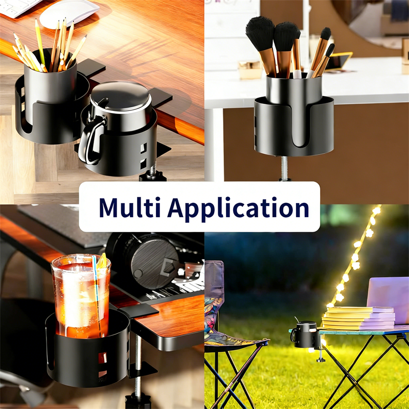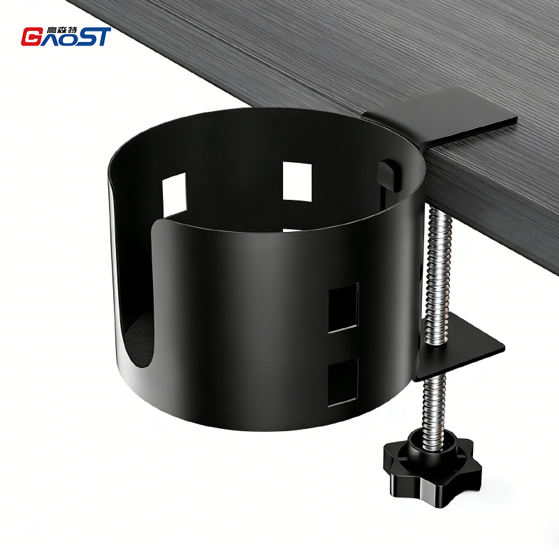 The OOKUU Large Anti-Spill Desk Cup Holder is a durable metal accessory designed to securely clamp onto desk edges, effectively preventing drink spills in various environments. Engineered for stability and convenience.