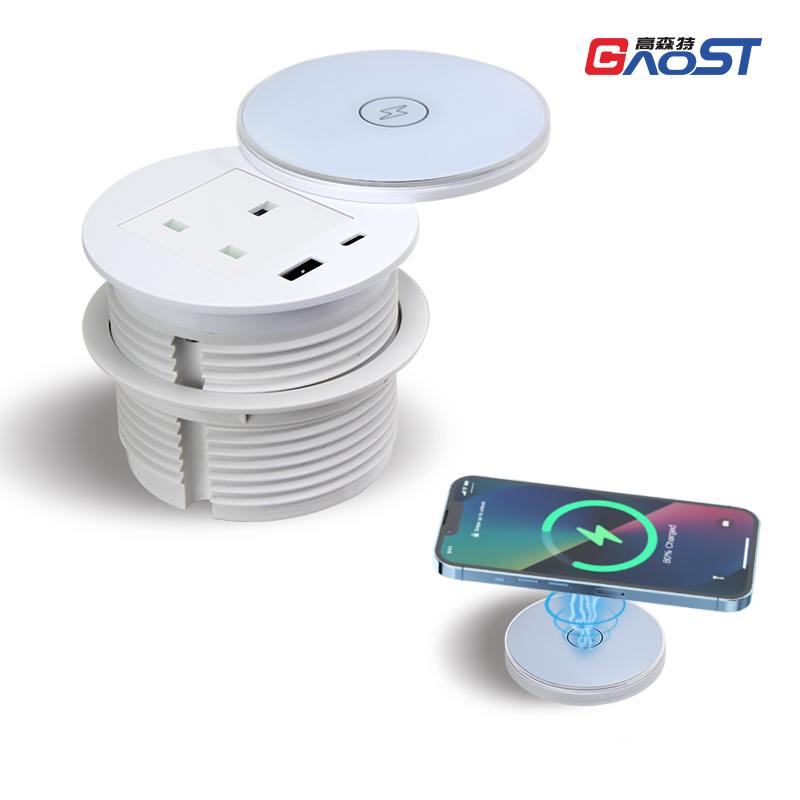 This innovative 3-in-1 multifunctional power grommet combines wireless charging, USB fast charging, and UK AC power in a sleek recessed design. Perfect for office desks, conference tables, and home furniture, it provides a complete charging solution while maintaining a clean, organized workspace.